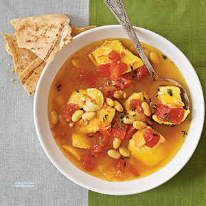 1. Heat oil in a large Dutch oven over medium-high heat. Add onion, fennel, coriander, garlic, and thyme sprig; sauté 5 minutes. Stir in rind and saffron; add water, clam juice, and tomatoes. Bring to a boil; reduce heat, and simmer for 5 minutes. Stir in salt, fish, and beans; cook 5 minutes. Top with thyme leaves.