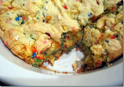 Combine the first four ingredients in a large bowl. Add the milk slowly – you want the batter to remain as dense as possible. Then mix in the rainbow sprinkles and white chocolate chips.