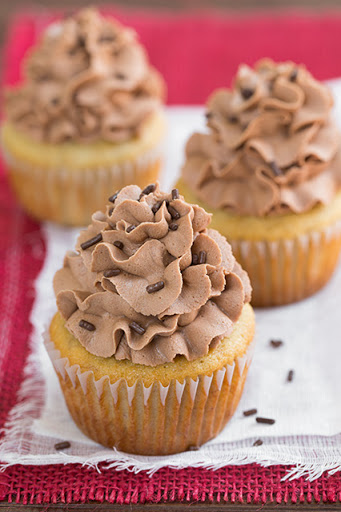 Preheat oven to 350 degrees. In a mixing bowl, whisk together flour, cornstarch, baking soda and salt for 30 seconds, set aside. Mash bananas together with lemon juice, set aside. In the bowl of an electric stand mixer fitted with the paddle attachment, whip butter, 1 Tbsp vegetable oil, granulated sugar and brown sugar until pale and fluffy, then mix in remaining 1 Tbsp vegetable oil. Blend in egg, then blend in egg white and vanilla. With mixer set on low speed and working in three separate batches, add in 1/3 of the flour mixture alternating with 1/2 of the buttermilk and mixing just until combined after each addition. Divide mixture among 14 - 15 paper lined muffin cups, filling each cup 2/3 full. Bake in preheated oven until toothpick inserted into center of cupcake comes out clean, about 18 - 22 minutes. Allow to cool in muffin tin several minutes then transfer to a wire rack to cool completely. Frost with Nutella Buttercream Frosting and top with sprinkles or chopped, toasted hazelnuts if desired. Store in an airtight container.