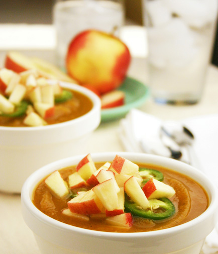 Purée the soup in batches in a blender or food processor until smooth, and return it to the saucepan. Heat the soup over low, thinning with more water if necessary. Serve with diced apples and jalapeño slices, if you like.