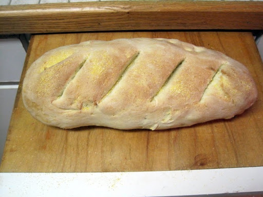 Remove the dough and place it on a floured surface and knead for 1 minute. Use a sharp knife and cut the dough into two equal pieces. Roll each piece into a rectangle. Roll up jelly roll fashion and pinch the seam together. Tuck the ends underneath. Line a baking sheet with a silpat mat and sprinkle with cornmeal. Place the bread on the prepared baking sheet; cover and let rise until it doubles in size, about 30 minutes.
