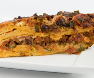 Layer with remaining tortillas, sausage, cheese and green onions.