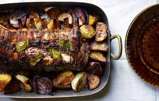 Transfer pork to roasting pan and nestle in among vegetables. Tuck remaining 6 bay leaves under kitchen twine over top of pork. Wrap bone tips with foil to prevent burning and roast, turning vegetables halfway through, until an instant-read thermometer inserted in the center of pork registers 140°, 60–75 minutes.