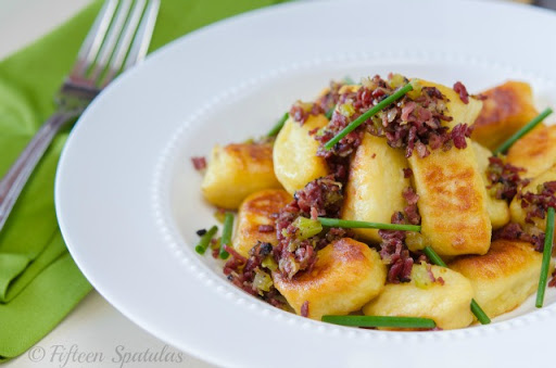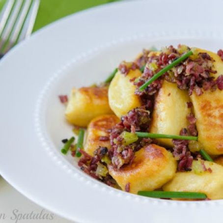 Homemade gnocchi is pan fried in butter and then topped with fried bits of pastrami and chives. Delicious!