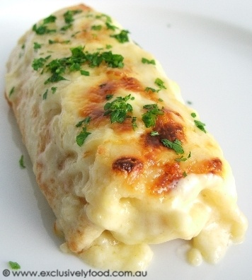 Before cooking, chill the crepe batter for a minimum of 30 minutes. The chilling sets the batter, resulting in light textured crepes. Do not boil or sour cream will curdle.