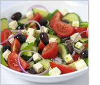 PLACE the olive oil, lemon juice, garlic, salt, pepper and oregano in a small jar with a screw-top lid and shake to combine. PLACE the salad ingredients in a large bowl. POUR the dressing over the salad and toss gently to combine just before serving. GARNISH the Greek salad with a little freshly ground black pepper.