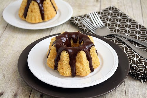 Add the flour and buttermilk mixtures alternately in thirds, beginning and ending with the flour. Toss the chocolate chunks with the remaining tablespoon of flour and fold into the batter. Divide the batter evenly among the wells of your mini bundt pan. Bake for 20-22 minutes, or until a toothpick inserted in the center comes out clean. Remove the pan to a wire rack and let cool for 10 minutes.