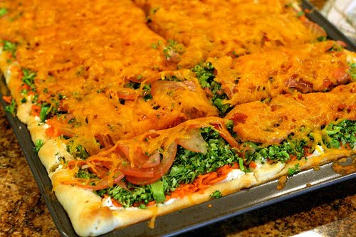 Lay crescent rolls flat onto a cookie sheet and press the seams together to make a "crust." Cook 7-8 minutes at 350 degrees. Mix mayo, ranch dip and cream cheese and spread it onto the crust once it cools. Chop all your veggies. I used a food processor on all of mine, but it would be fine to chop by hand, just remember to do it as finely as possible. Sprinkle crust and spread with your finely chopped vegetables. Cover and refrigerate for 3-4 hours. I did it the day before and refrigerated overnight, which also worked fine. Top with cheddar cheese. Then broil for 3-4 minutes until the cheese melts.