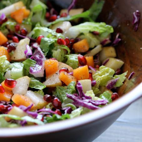 In a large bowl, combine romaine, red cabbage, Fuji apple, Asian pear, Fuyu persimmons and pomegranate seeds; toss to mix.