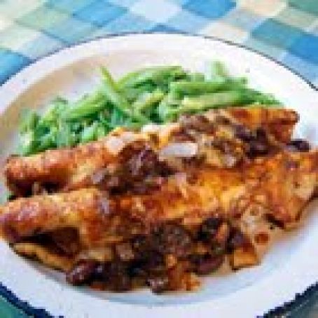 2.Spread 1 can of chili and beans in the bottom of a 9x13 inch baking dish. Roll up franks inside tortillas and place in baking dish, seam side down, on top of chili and bean 'bed'. Top with remaining can of chili and beans, and sprinkle with cheese.