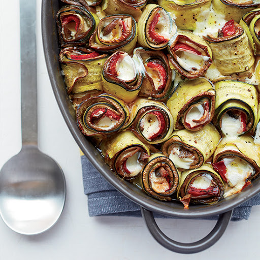Spoon the tomato sauce into a shallow 2 1/2-quart baking dish and scatter the bread cubes on top. On a work surface, top each zucchini slice with a slice of eggplant; blot dry if necessary. Place a strip of roasted pepper and anchovy and a stick of mozzarella at one end of each stack and roll up. Stand the rolls in the baking dish and brush with oil.