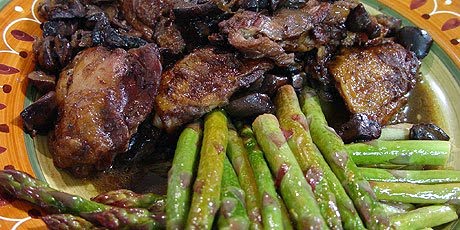 2. Add the onions and mushrooms to the pan. Sauté first until they begin to release their juices then as they start to become golden brown. Place the chicken thighs back into the pan; then add the stock, wine, salt and pepper. Bring to a slow simmer; a boil will toughen the meat. Cover the pan with a tight fitting lid so that no moisture escapes and simmer slowly until the meat is very tender and falling off of the bone, about 45 minutes.