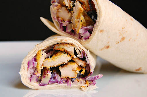 4. When ready to serve, slice chicken on the bias. Spread slaw onto wraps and top with chicken. Wrap tightly and cut in half.