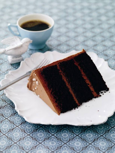 Place one cake layer on a serving platter. Spread 1/4 cup of the caramel over the top. Let the caramel soak into the cake, then spread 3/4 cup of the ganache frosting over the caramel. Sprinkle 1 teaspoon of the fleur de sel over the frosting, then top with the second cake layer. Spread with caramel frosting and sprinkle with 1 teaspoon of the fleur de sel. Then top with the third layer. Spread with caramel. Crumb coat the cake and put the cake in the refrigerator for 15 minutes to firm up the frosting. Frost the sides and top with the remaining frosting. Garnish with a sprinkle of fleur de sel.