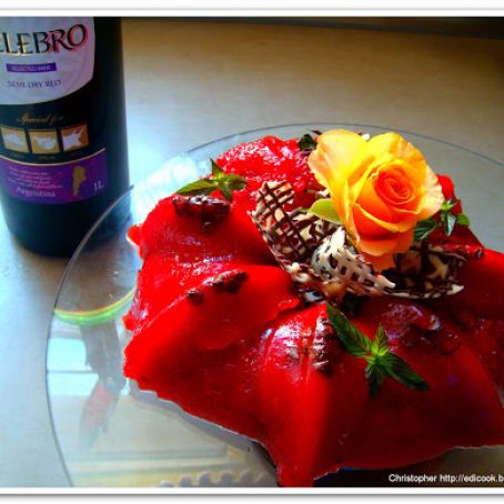 Arbuz przekroić na połowę i wydrążyć łyżką miąższ. Przełożyć do miski i zmiksować blenderem. Całość przecedzić do garnka przez gęste sito. Otrzymany sok, powinno go być około 900 ml, nastawić na gaz, dodać wino i cukier. Podgrzewać mieszając do zagotowania. Dodać żelatynę, wymieszać i już nie gotować. Wystudzić i do tężejącej galaretki dodać starte ( pokruszone) kawałeczki czekolady. Całość wlać do formy i wstawić do lodówki do całkowitego stężenia (około 5 godzin). Wyłożyć na paterę. Pokroić i podawać skropione aceto balsamico di Morena z listkiem mięty i czekoladą z kardamonem.
