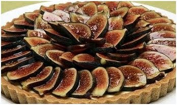7. Remove the chilled tart from the refrigerator. Starting at the outside edge, place the fig slices, pointed ends upward, in concentric circles on the filling, tilting the slices so they lean slightly toward the edge of the crust in a petal-like fashion.