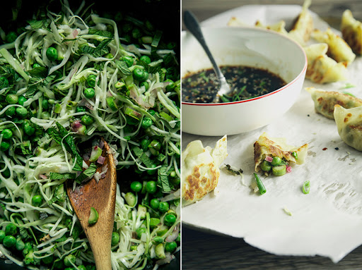 Heat 1 ½ teaspoons of the grapeseed oil in a large saute pan over medium heat. Add the shallots and ginger to the pan. Stir them up and cook until fragrant and shallots are translucent, about 2 minutes. Add the asparagus, peas and cabbage to the pan. Sauté until the peas and asparagus are bright green and the cabbage is slightly wilted. Add the lime juice, season the mixture to taste and remove from the heat. Add the mint, stir, and allow the mixture to cool.