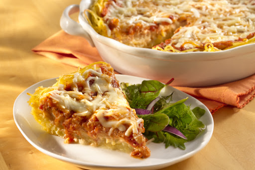 Spoon Ricotta cheese over spaghetti crust. Top with pasta sauce. Bake in preheated 350°F oven 25 minutes. Top with Mozzarella cheese. Bake 5 minutes more or until cheese is melted. Sprinkle with remaining Parmesan cheese. Cool 10 minutes before cutting.