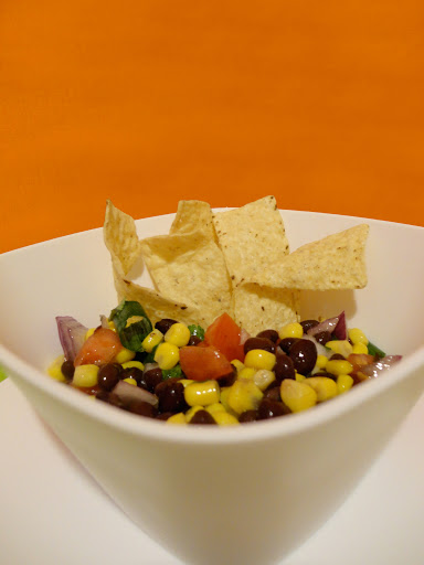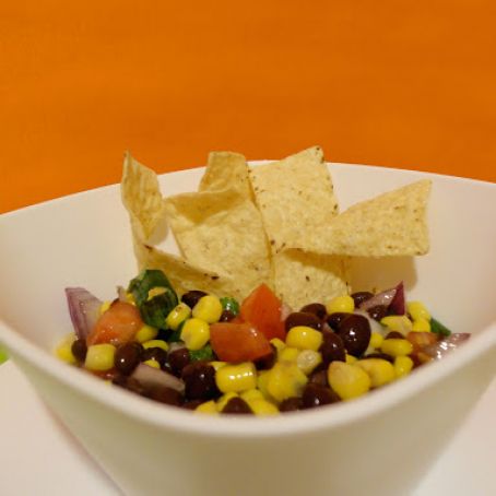 Chop the tomato, avocado, red onion, scallion, and cilantro. Place them in a bowl with the black beans and corn. Add the lime juice, and salt and pepper if you wish. Mix it up and serve with tortilla chips.