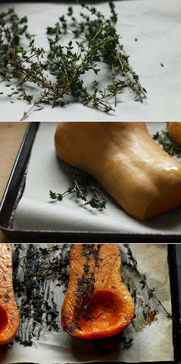 Preheat the oven to 400 degrees F. Cut butternut squash in half, deseed, cover in evoo, sprinkle with salt, pepper, dried thyme and lay face down on the thyme sprigs. Place squash in the oven and roast until very tender, about 30 minutes. Remove from the oven and cool.