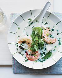 In a large pot, combine the coconut milk with the clam juice, sliced jalapeño, fish sauce, curry paste, sugar and 1/4 cup of water and bring to a boil. Simmer for 2 minutes. Add the shrimp, scallops and scallions and cook until the shrimp and scallops are just white throughout, about 2 minutes. Stir the mint, basil and cilantro into the soup and serve with lime wedges and steamed rice.