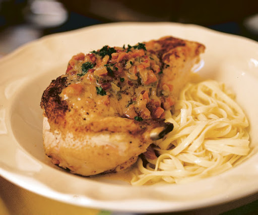 Remove the chicken from the pan, turn the heat to high and bring the liquid to a boil. Reduce the volume of liquid by half, about 5 minutes (or 6 to 7 minutes if you want a thicker sauce). Add the cream, stir to combine, and remove the pan from the heat. Transfer the chicken to wide soup plates; taste and season the sauce with salt and pepper if necessary and spoon it over the chicken. Sprinkle with the chopped parsley.