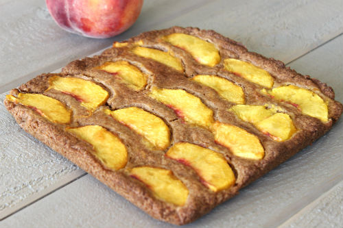 Press the dough into the baking dish until fully covered, then place the peach slices on top of the dough.