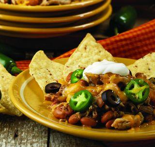 At serving time, arrange corn chips on serving plates. Spoon pork mixture over chips; garnish as desired.