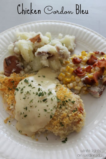 Lay all of the chicken breast halves in a single layer in the bottom of your baking dish – unlike the traditional CCB recipe, there is no second layer of chicken in this dish. Top each breast with two slices of ham and 1 slice of cheese, so that the entire breast is covered. Sprinkle bread crumbs over the top of the chicken.