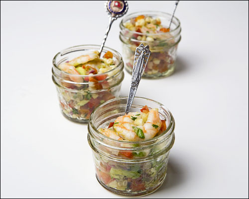 5. Cut the kernels from the corn and place in a bowl with the shrimp (halved lengthwise or chopped, if desired), roasted red bell pepper and remaining ingredients. Season to taste with salt and pepper and keep refrigerated until ready to serve. (Can be made several hours ahead of time.) Serves 6 to 8