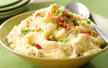 Spoon potatoes into serving dish. Top with remaining crumbled bacon and the green onions.