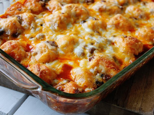 In large bowl, stir together beef, beans, enchilada sauce and tomato sauce. Stir in biscuit pieces. Spread mixture evenly in baking dish. Sprinkle cheese over top.