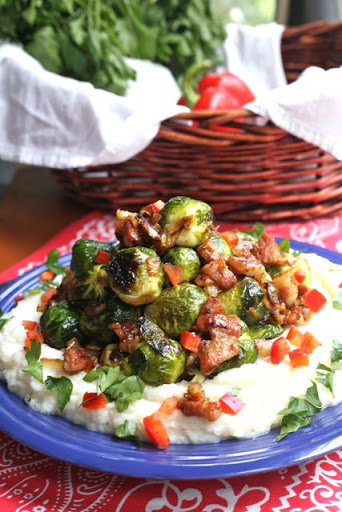 Place mashed cauliflower on a large plate. Place brussels sprouts over top. Sprinkle red pepper and parsley over top and serve. Serves 4-6.