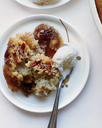 Set the dish on a rimmed baking sheet and bake for 40 minutes, until the cake is golden. Let cool for 5 minutes, then scoop into bowls and serve with ice cream.