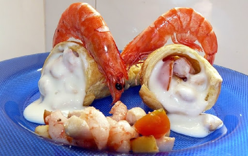 4.- Mezcle la carne del cangrejo con la crema, el cebollino picado, la ralladura de la naranja, sal y pimienta. Rellene los cucuruchos con la mezcla y dispóngalos en un plato. Ponga en un lado 5 gajos de naranja y en él otro ensalada y bañelos con el aliño. Decore con hojas de estragón y perifollo y coloque la carne de la punta del cangrejo para realzar más el plato.