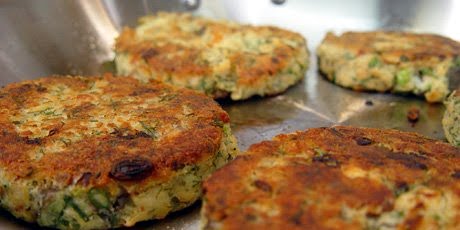 # Form into 4 large patties. If the mixture seems a bit loose and won't form a well-packed cake, add some breadcrumbs until it binds well.