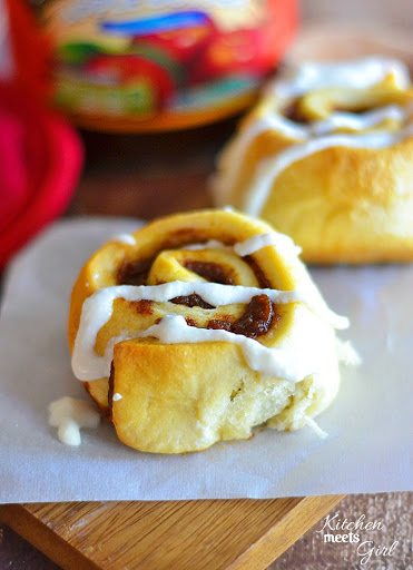While the rolls are baking, whisk together the softened cream cheese, powdered sugar, milk and vanilla. If your frosting is too thick, add in a splash of milk until desired consistency. Drizzle over warm rolls, and enjoy!