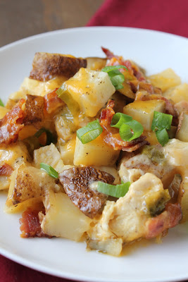 Spread the remaining diced potatoes on top, followed by the remaining bacon, another 1/2 cup cheese, remaining green onions and another 1/4 teaspoon each salt and pepper.