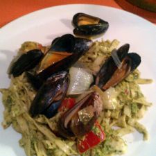 Recipe courtesy of Mario Batali. Every time I make this dish I wish I would've worn gloves. The pepper oil gets into your skin and is hard to wash out, but the dish is full of fresh flavors.