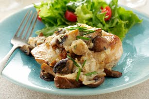 TOP chicken with mushrooms and cheese; cover. Cook 2 to 4 min. or until cheese is melted; sprinkle with chives.