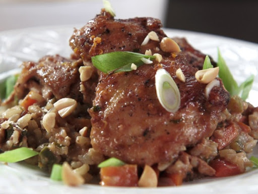 Stir in the cilantro, and then arrange the chicken thighs on top of the rice and vegetables.