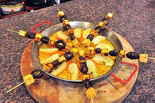 Paella with Fennel and Seitan Sausages, Tofu and Mushroom Shish Kabob
