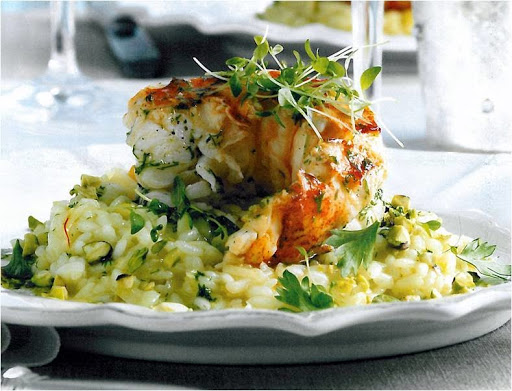6 To serve, force open shells more widely. Grasping meat with tongs, loosen at bottom and pull out. Place lobster on a bed of risotto. Nap with butter and juices from broiling pan; liberally sprinkle with pistachios. Serve right away.
