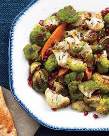 Just before serving, drizzle vinaigrette over warm vegetables, and toss with pomegranate seeds.