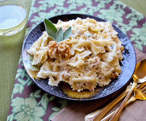 “Grown-up” mac and cheese dish--Caramelized onions are tossed with goat cheese, toasted walnuts and sage.