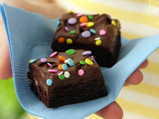 Frost brownie with frosting. Sprinkle with candy sprinkles. For brownies, cut with plastic knife into 4 rows by 4 rows. Store covered at room temperature.