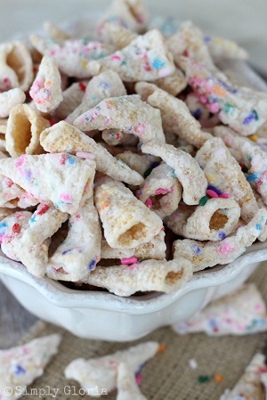 2.Put the Bugles in a large mixing bowl and pour the melted white chocolate. Immediately start to shake on the cake batter mix, along with the sprinkles. Use a large wooden spoon to gently mix and combine all of these toppings to surround each and every Bugle. You may want to switch and use your hands.