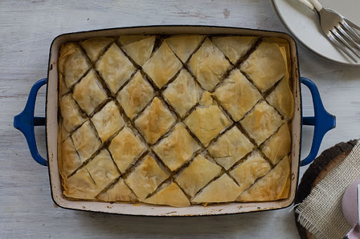 5. Butter the next 5 sheets, placing them buttered-side down into the baking dish. Top the 5th layer of phyllo dough with a few teaspoons of pumpkin mixture and walnuts. Repeat this for the next two layers. You should end up with four layers of baklava. Using a sharp knife, slice the baklava into 1-inch diamonds or squares. Transfer to the oven to bake for 15-20 minutes, until the top is lightly golden brown and crisp.