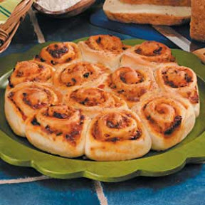 • Roll each portion into a 16-in. x 10-in. rectangle; spread with pizza sauce. Top with the onion mixture, pepperoni, pizza cheese and olives. Roll up each rectangle jelly-roll style, starting with a long side; pinch seam to seal. Cut each into 12 slices (discard end pieces).