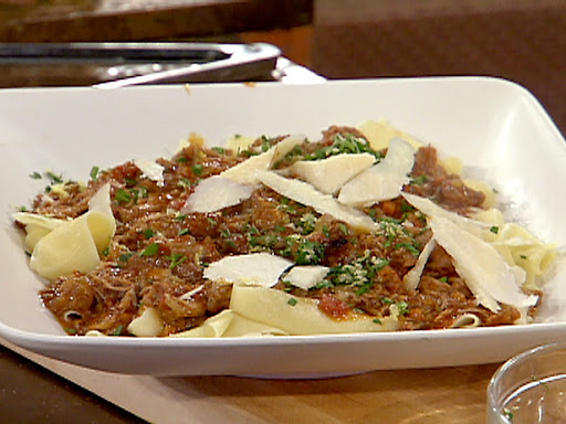 8. Serve the pappardelle with the ragu and garnish with the gremolata and the shaved Parmesan.
